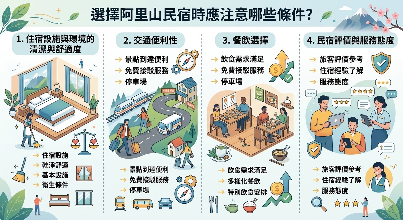 - 交通便利性:檢查民宿是否方便到達阿里山景點,是否提供免費接駁服務,是否有停車場等。